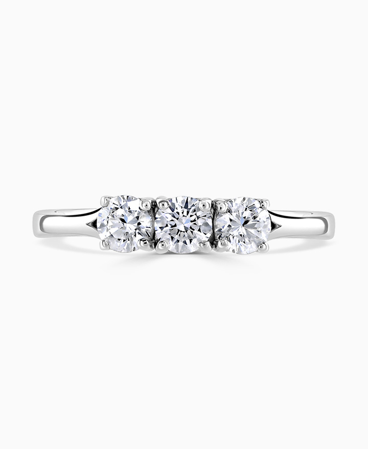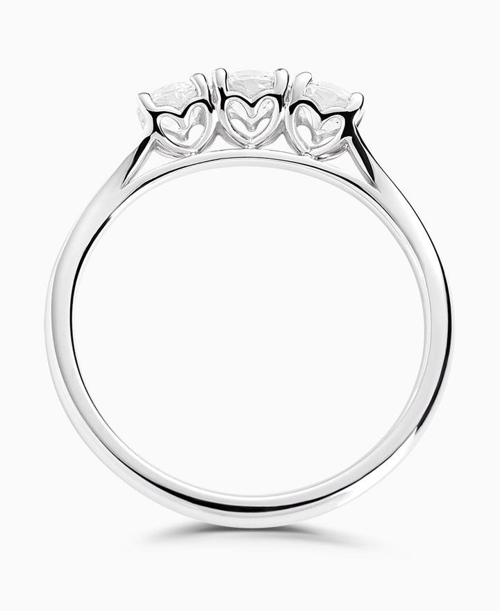 Handcrafted by Brown & Newirth; love heart detailing for this trilogy of round brilliant cut diamonds, presented here on a classic court band. 0.60ct