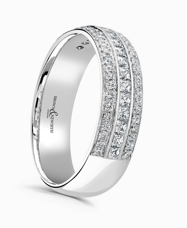 Handcrafted by Brown & Newirth; a triple row of pave set square princess and round brilliant cut diamonds adorn 40% of this classic court band. Total carat weight 0.53ct