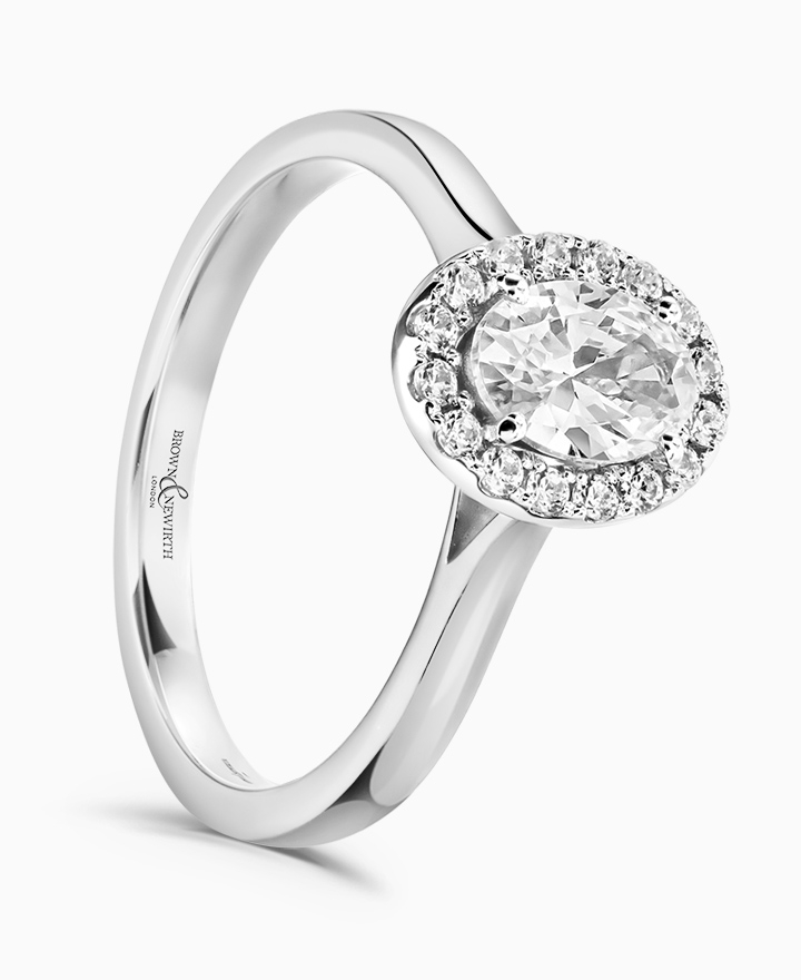 Handcrafted by Brown & Newirth; our signature 'bloom' floral detailing with diamond halo framing an oval cut G Vs diamond, presented here on a classic court band. Centre 0.70ct, total 0.86ct. Part of the Bloom Collection.