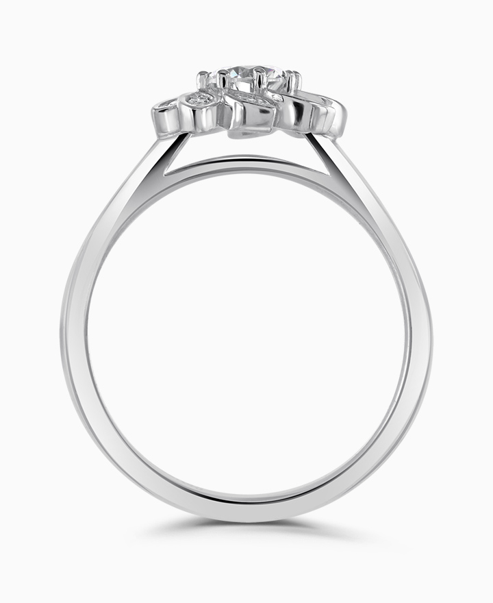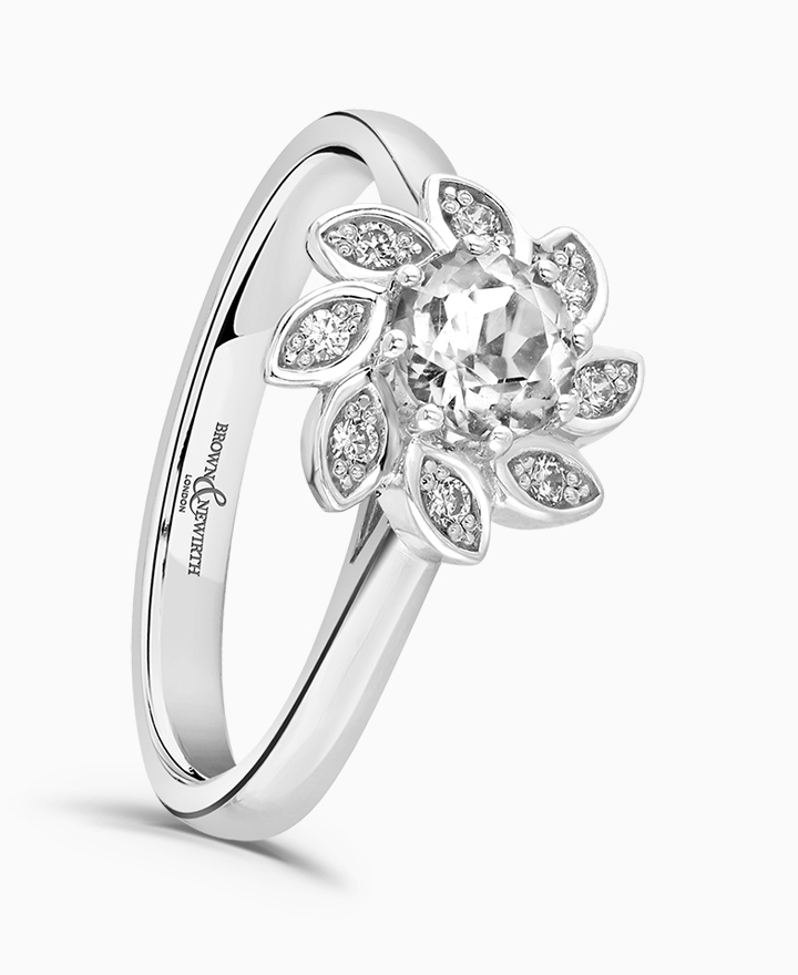 Handcrafted by Brown & Newirth; a diamond halo with petal detailing frames the round brilliant cut diamond, presented here on a straight edged band. Centre 0.40ct, total 0.48ct. Part of the Vintage Collection