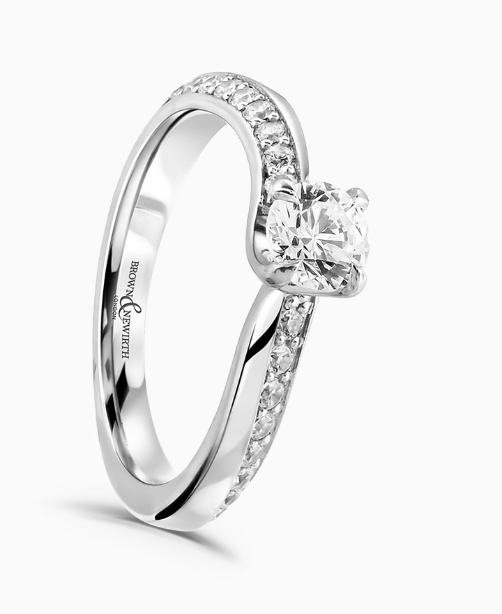 Handcrafted by Brown & Newirth; inspired by nature, diamonds sweep across towards a finely set round brilliant cut diamond, presented here on diamond set band. Centre 0.50ct, total 0.75ct. Part of the Entwined Collection.