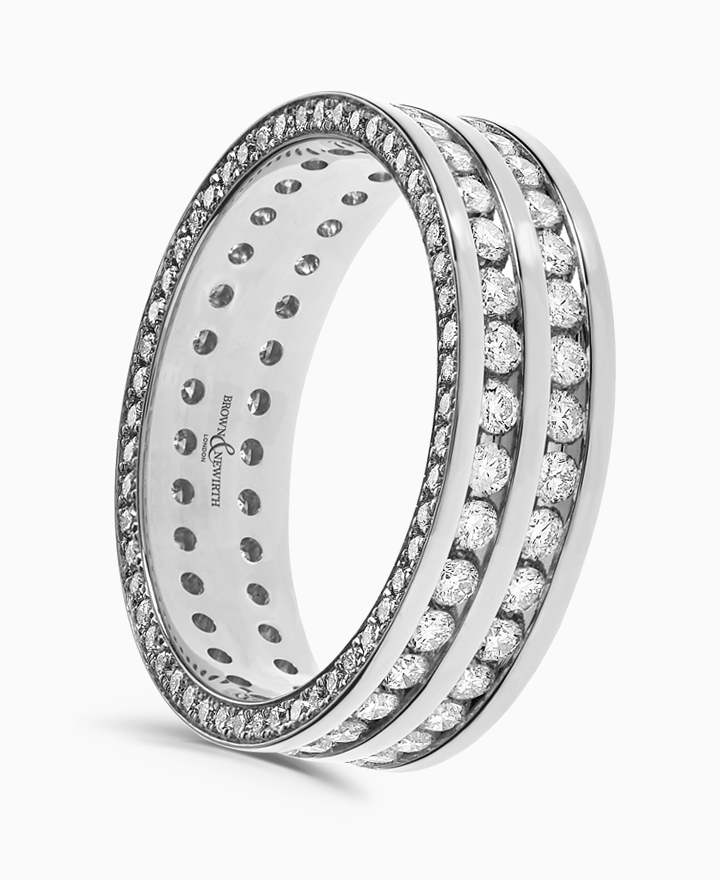 Handcrafted by Brown & Newirth; a full hoop, double row of round brilliant diamonds elevated by matching side-set diamonds. Part of the Opulence Collection. Total carat weight 1.5ct