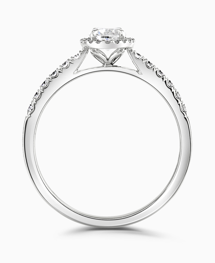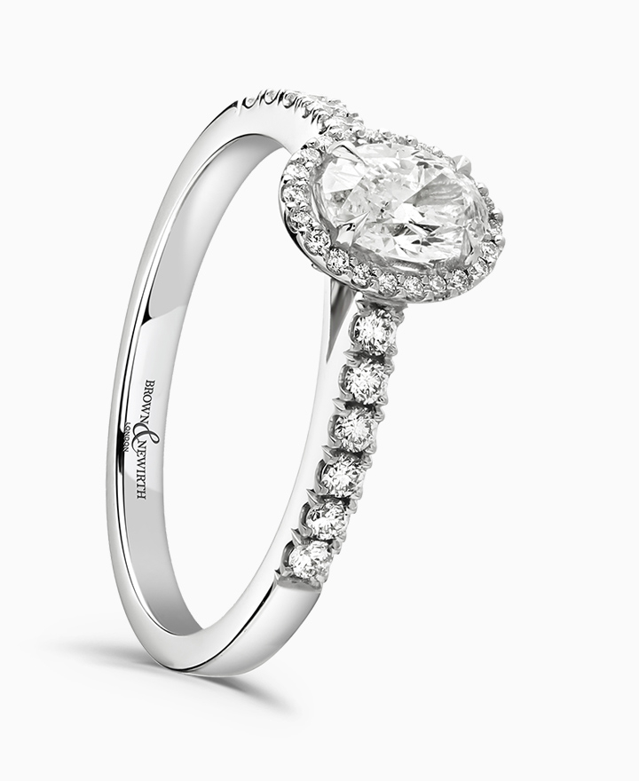 Handcrafted by Brown & Newirth; our signature 'bloom' floral detailing with diamond halo framing an oval cut diamond, presented here on a diamond set band. Centre 0.50ct, total 0.72ct. Part of the Bloom Collection.