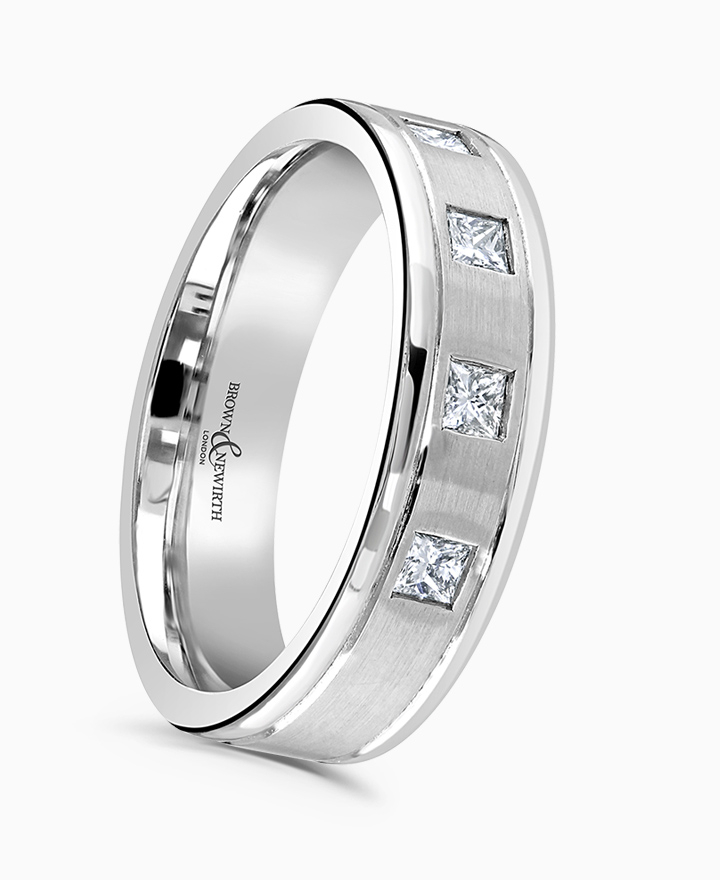 Handcrafted by Brown & Newirth; four bezel set square princess cut diamonds, set in matte centre with contrasting polished edges, presented on a flat top band. Total carat weight 0.32ct