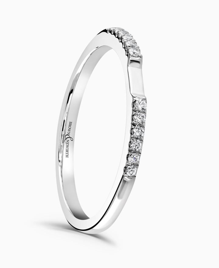 Handcrafted by Brown & Newirth; open set round brilliant cut diamonds with cut away for matching ring this straight edged band. Total carat weight 0.18ct