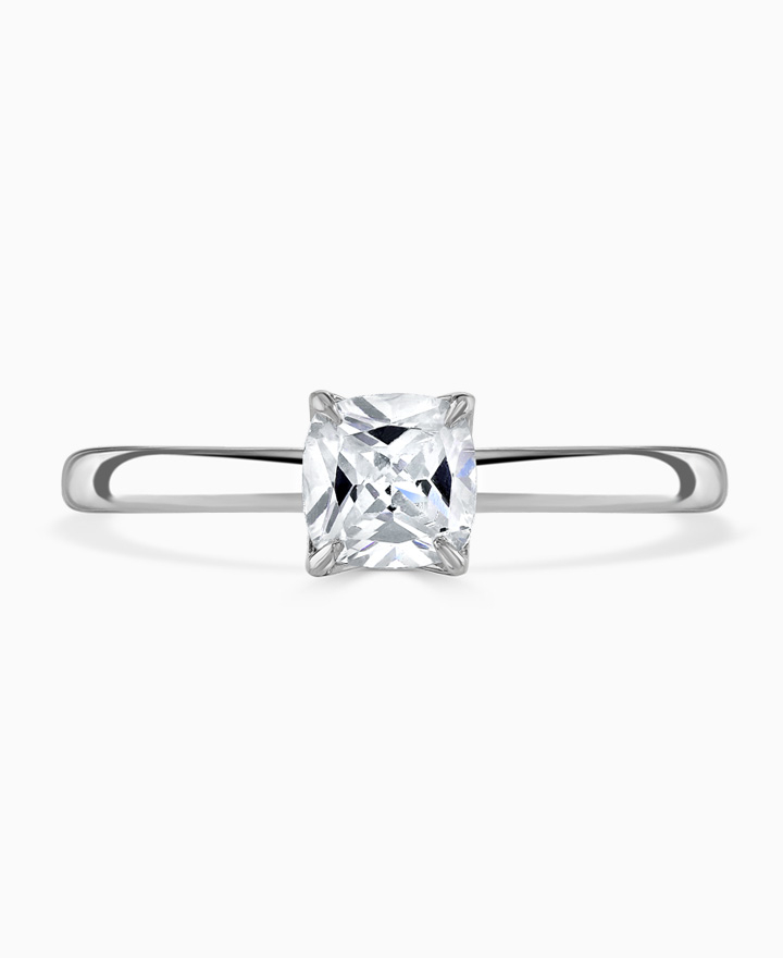Signature. Handcrafted; our signature 'bloom' floral detailing for a cushion cut diamond, presented here with side set diamonds on a classic court band. Centre 0.70ct, total 0.77ct. Part of the Bloom Collection.