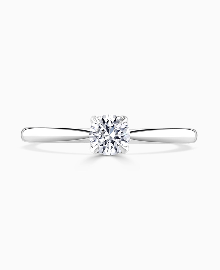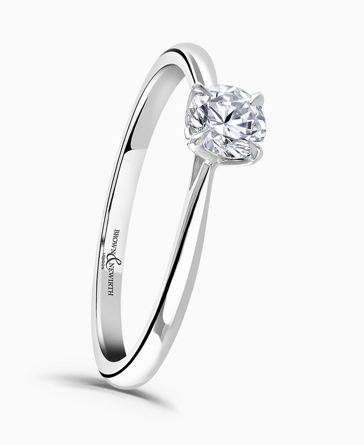 Handcrafted by Brown & Newirth; our signature 'bloom' floral detailing for a round brilliant cut diamond, presented here on a classic court band. 0.25ct. From our Bloom Collection. Part of our in stock range, order today for quick delivery.
