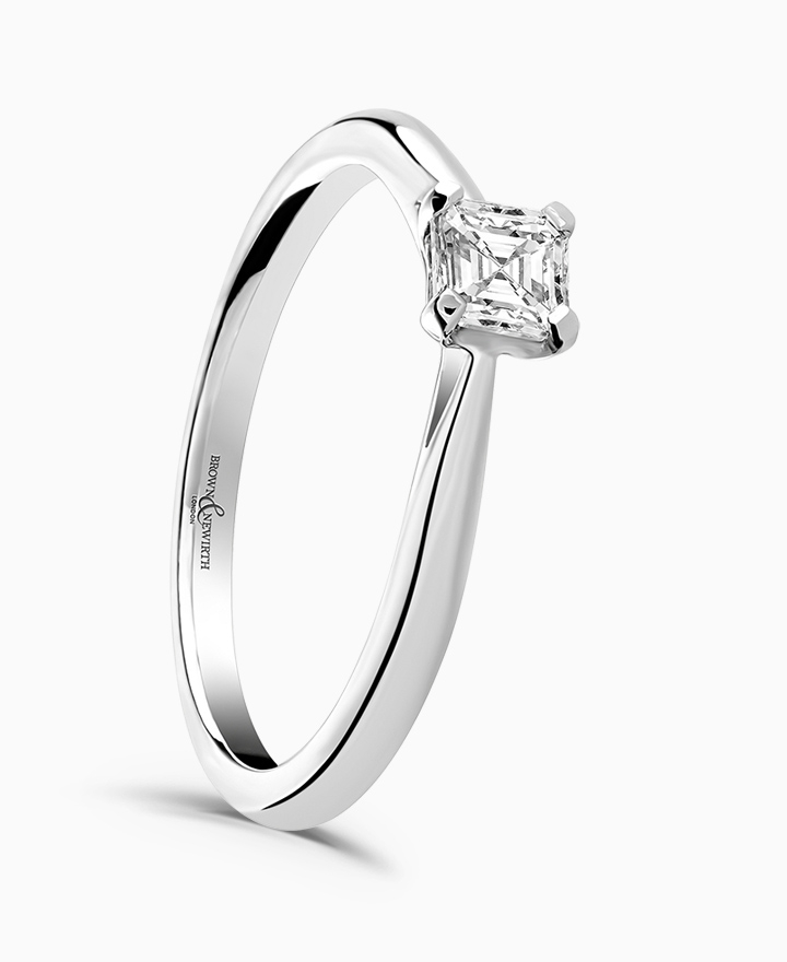 Handcrafted by Brown & Newirth; a delicate four claw setting perfectly elevates the square ashier cut diamond, presented here on a classic court band. 0.75ct