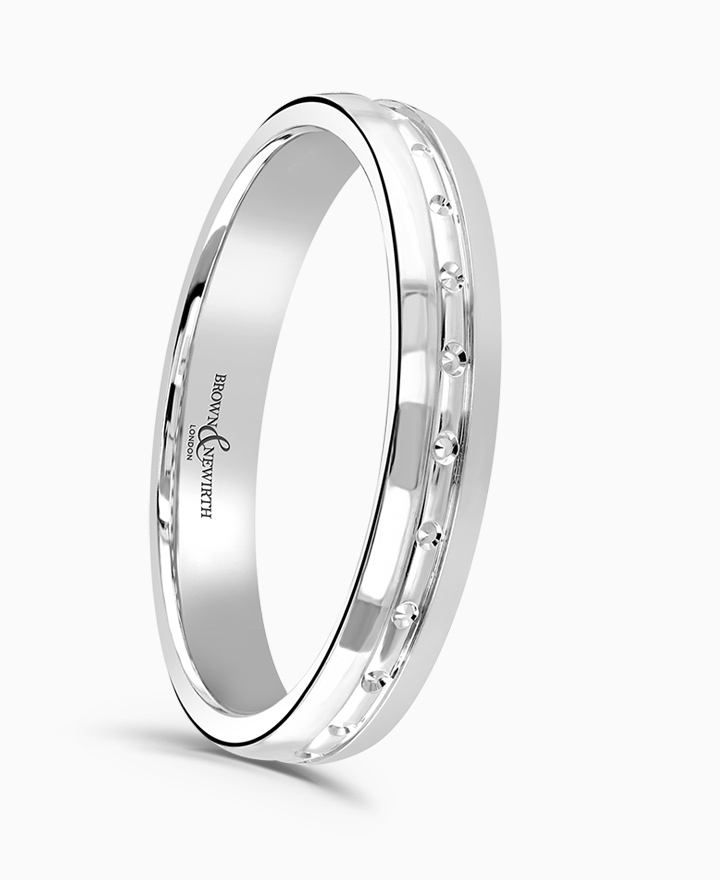 Handcrafted by Brown & Newirth; our classic court profile with rolled centre featuring pearl cut detailing, presented in a light gauge.