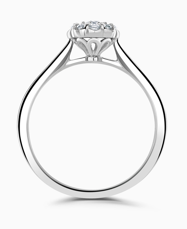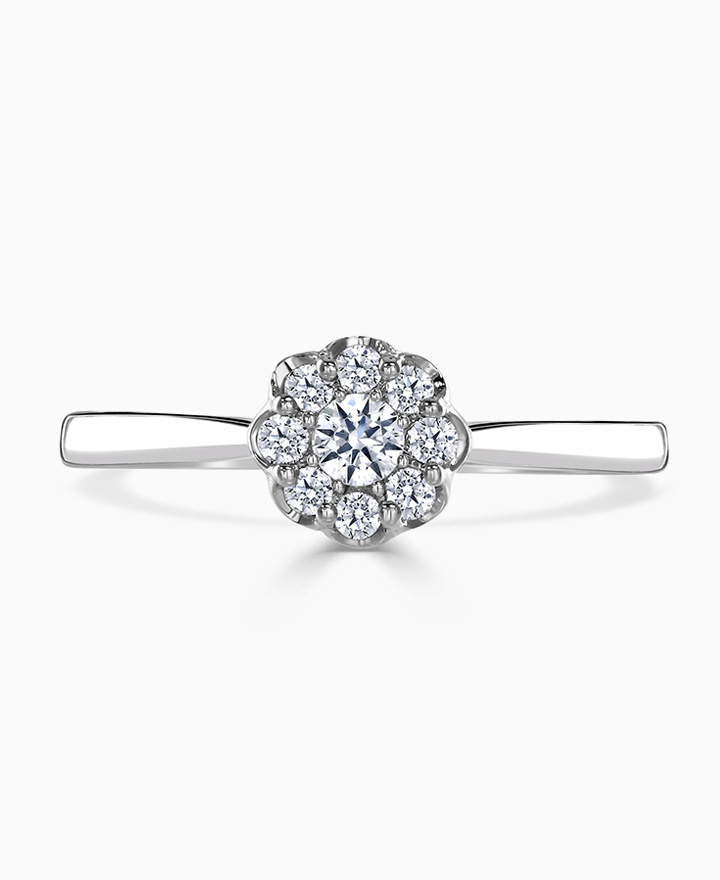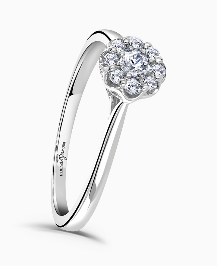 Handcrafted by Brown & Newirth; a diamond halo frames the round brilliant cut diamond, presented here on a classic court band. 0.25ct. Part of the Daisy Collection.
