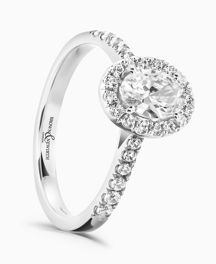 Handcrafted by Brown & Newirth; our signature 'bloom' floral detailing with diamond halo framing an oval cut G Vs diamond, presented here on a classic court band. Centre 0.70ct, total 1.05ct. Part of the Bloom Collection.
