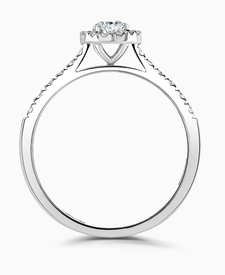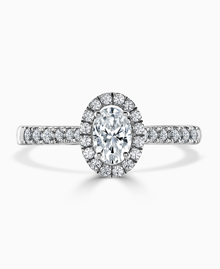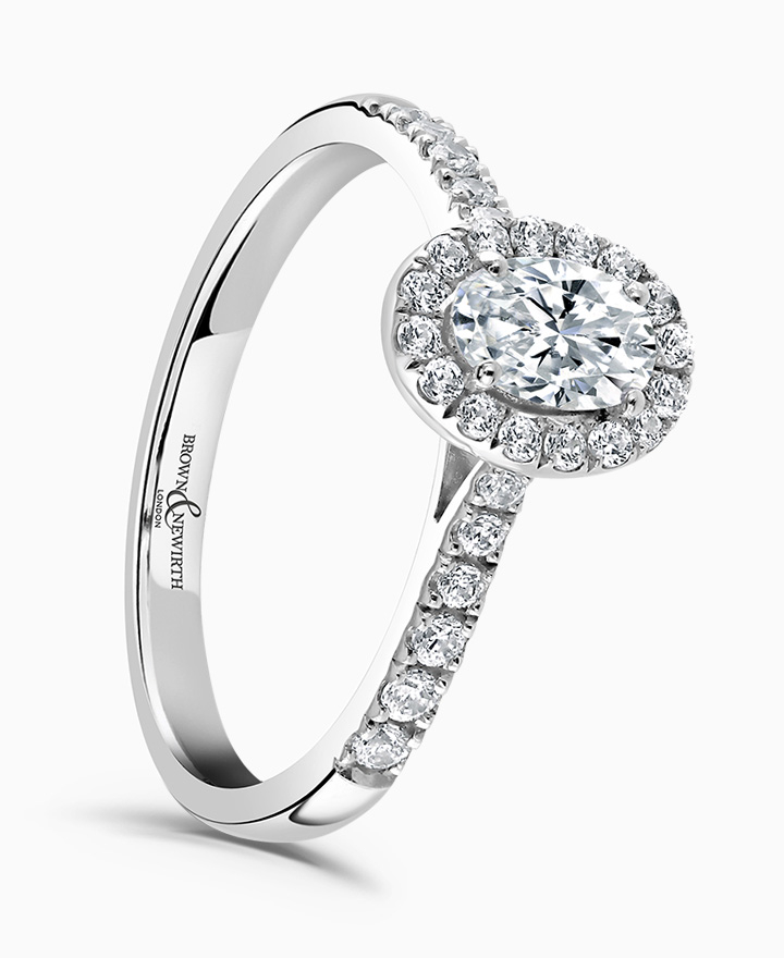 Handcrafted by Brown & Newirth; our signature 'bloom' floral detailing with diamond halo framing an oval cut diamond, presented here on a classic court band. Centre 0.50ct, total 0.80ct. Part of the Bloom Collection.
