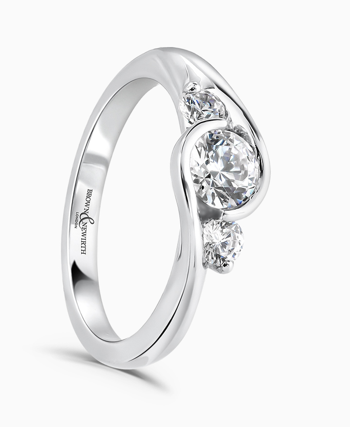 Handcrafted by Brown & Newirth; inspired by nature, organic lines twist up to embrace a trilogy of round brilliant cut diamonds, presented here on a classic court band. Centre 0.50ct, total 0.70ct. Part of the Entwined Collection.