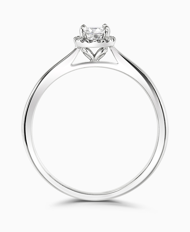 Handcrafted by Brown & Newirth; our signature 'bloom' floral detailing with diamond halo framing a cushion cut diamond, presented here on a classic court band. Centre 0.25ct, total 0.28ct. Part of the Bloom Collection.