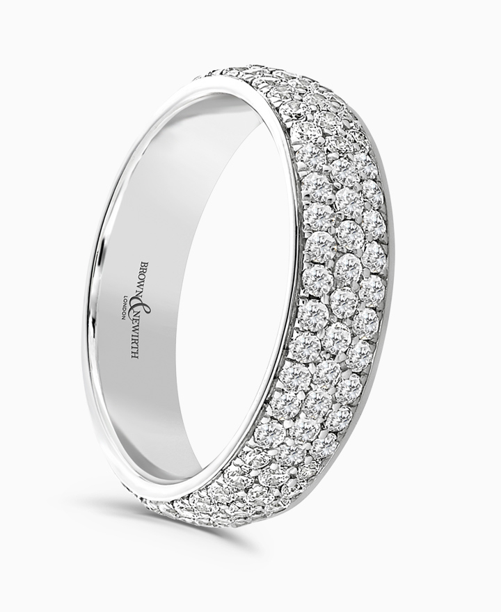 Handcrafted by Brown & Newirth; a triple row of round brilliant cut diamonds in a pave setting adorn the full hoop of this classic court band. Total carat weight 1.4ct