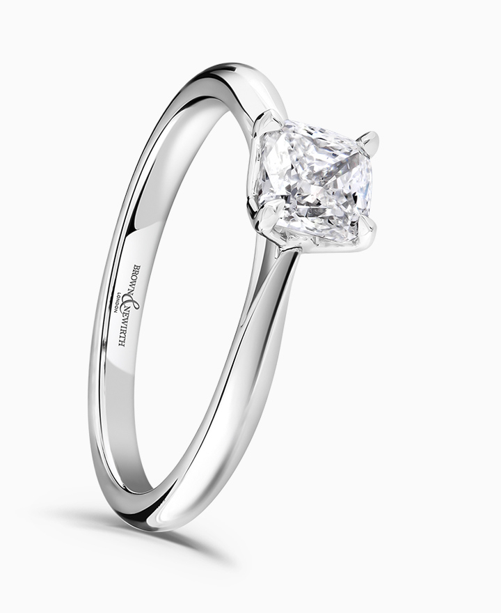 Handcrafted by Brown & Newirth; our signature 'bloom' floral detailing for a cushion cut diamond, presented here on a classic court band. 0.50ct. From our Bloom Collection. Part of our in stock range, order today for quick delivery.
