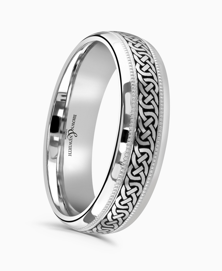 Handcrafted by Brown & Newirth; our classic court profile with Celtic knot detail inlayed with black ceramic. Presented in a medium gauge.