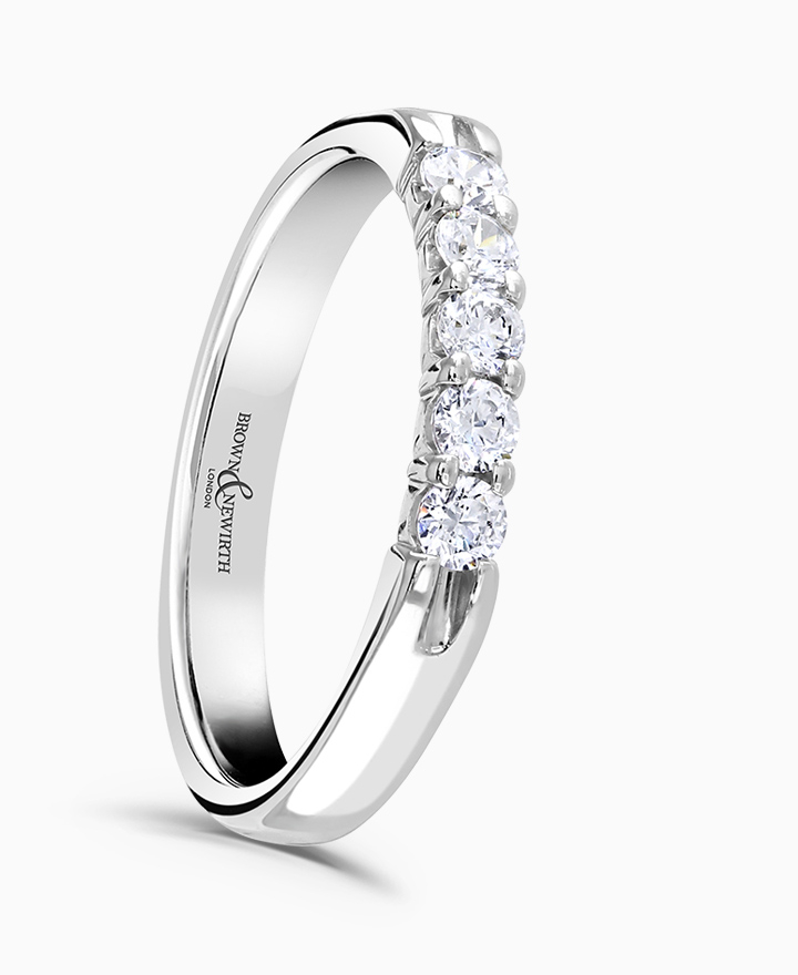 Handcrafted by Brown & Newirth; five round brilliant cut diamonds adorn 20% of this classic court band. Total carat weight 0.40ct