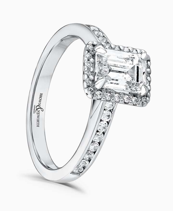 Handcrafted by Brown & Newirth; our signature 'bloom' floral detailing with diamond halo framing a rectangular emerald cut diamond, presented here on a diamond set band. Centre 0.50ct, total 0.72ct. Part of the Bloom Collection.