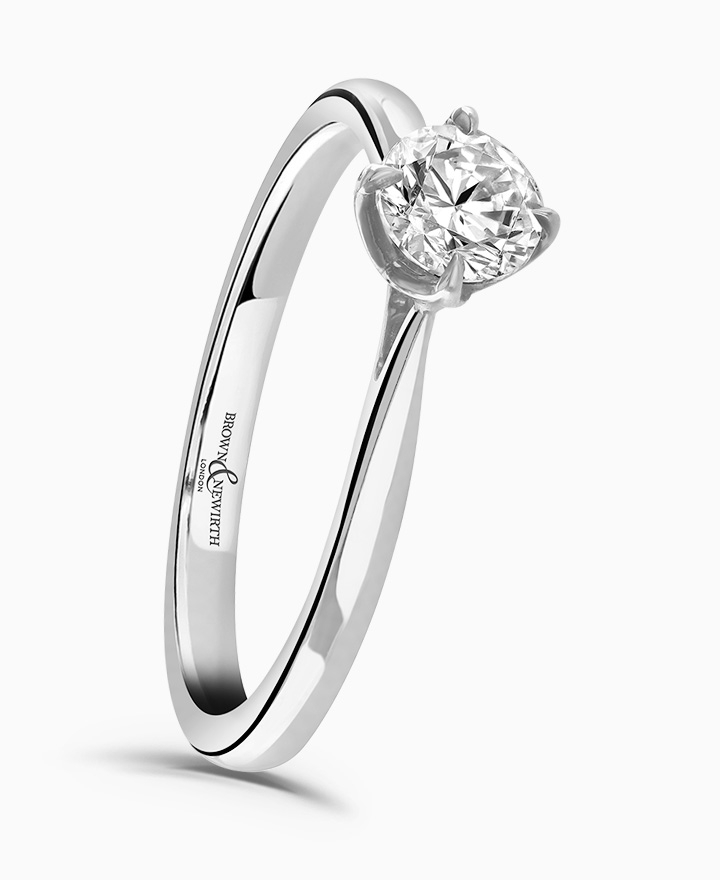 Handcrafted by Brown & Newirth; our signature 'bloom' floral detailing for a round brilliant cut diamond, presented here on a classic court band. From our Bloom Collection. 0.50ct. Part of our in stock range, order today for quick delivery.