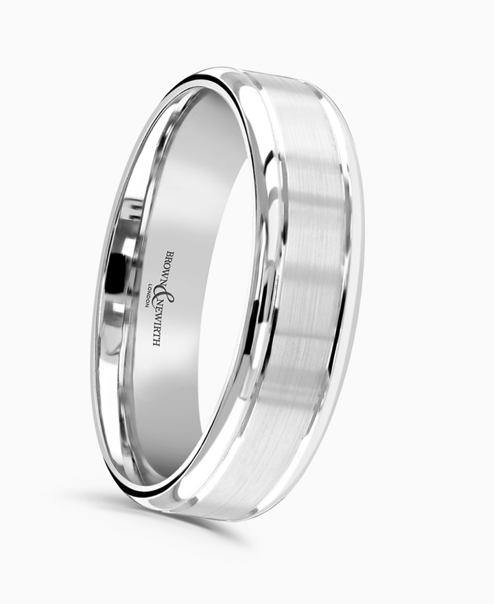 Handcrafted by Brown & Newirth; our flat top, rolled edge profile with brushed centre framed with v-cut channels, presented in a medium gauge.
