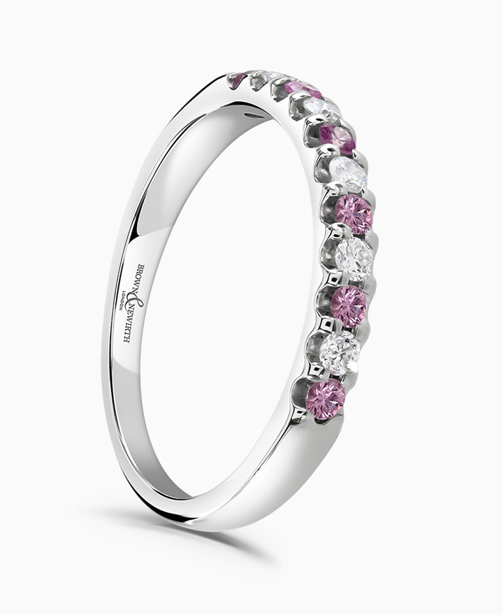 Handcrafted by Brown & Newirth; round brilliant cut diamonds and pink sapphires adorn 40% of this classic court band. Total carat weight 0.33ct