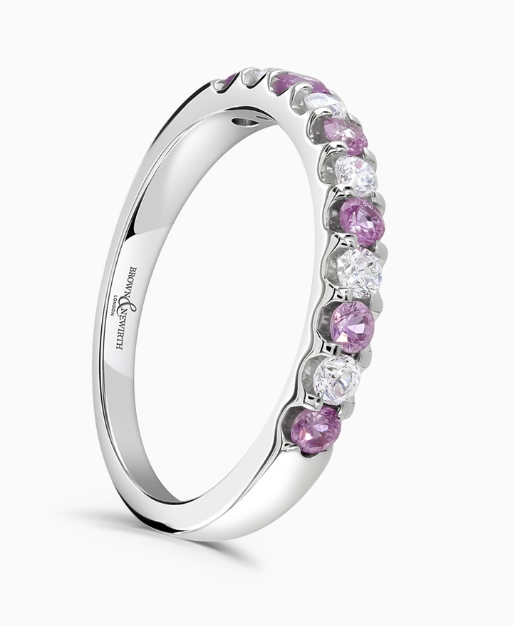 Handcrafted by Brown & Newirth; round brilliant cut diamonds and pink sapphires adorn 40% of this classic court band. Total carat weight 0.50ct