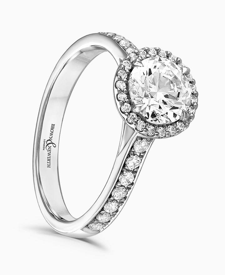 Handcrafted by Brown & Newirth; our signature 'bloom' floral detailing with diamond halo framing a round brilliant cut diamond, presented here on a diamond set band. Centre 0.50ct, total 0.68ct. Part of the Bloom Collection.