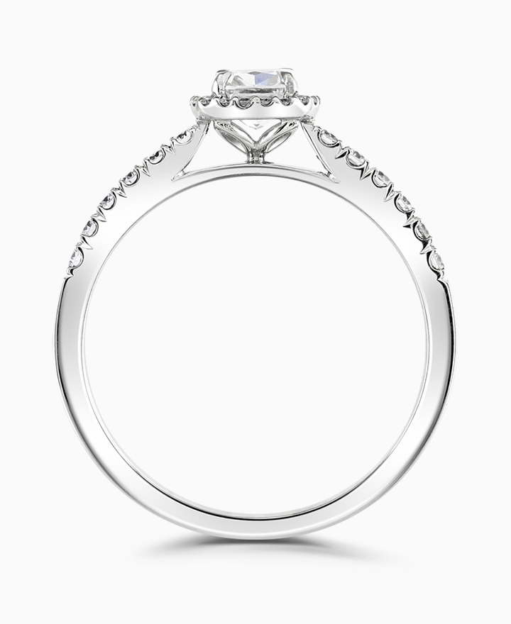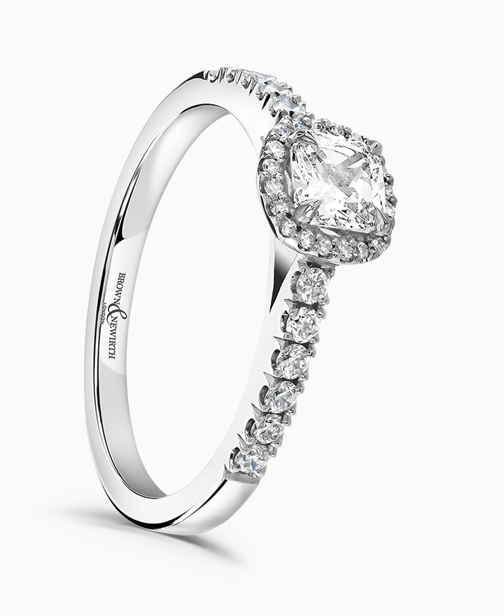 Handcrafted by Brown & Newirth; our signature 'bloom' floral detailing with diamond halo framing a cushion cut diamond, presented here on a diamond set band. Centre 0.50ct, total 0.72ct. Part of the Bloom Collection.