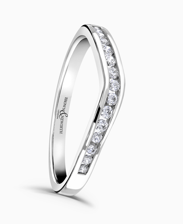 Handcrafted by Brown & Newirth; round brilliant cut diamonds flow through a curved top edge adorning of this square edged band. Total carat weight 0.14ct