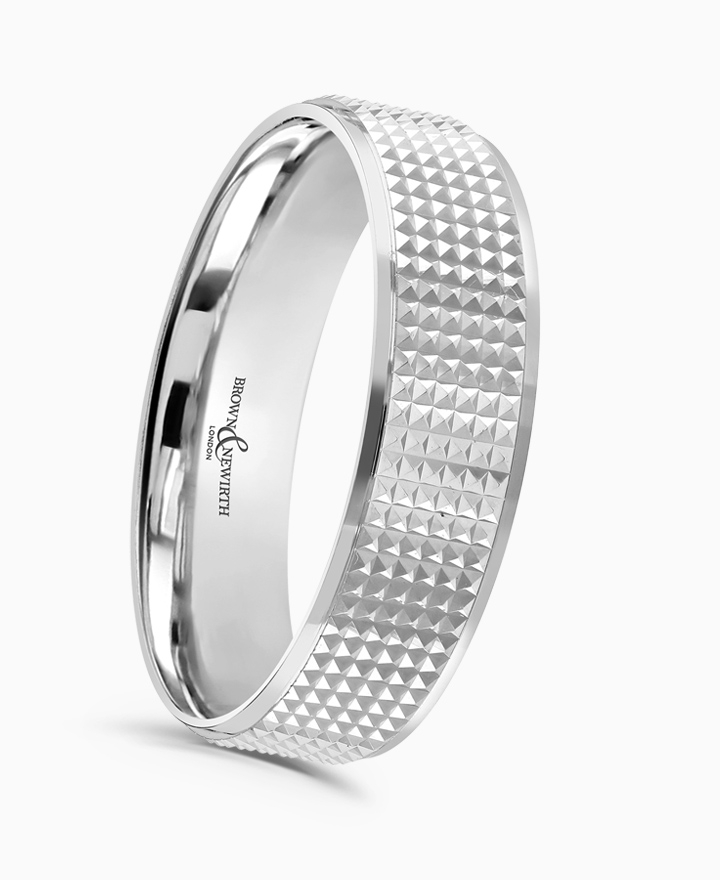Handcrafted by Brown & Newirth; our flat top profile with knurled patterning and contrasting polished bevelled edges, presented in a medium gauge. Part of the Guilloche Collection