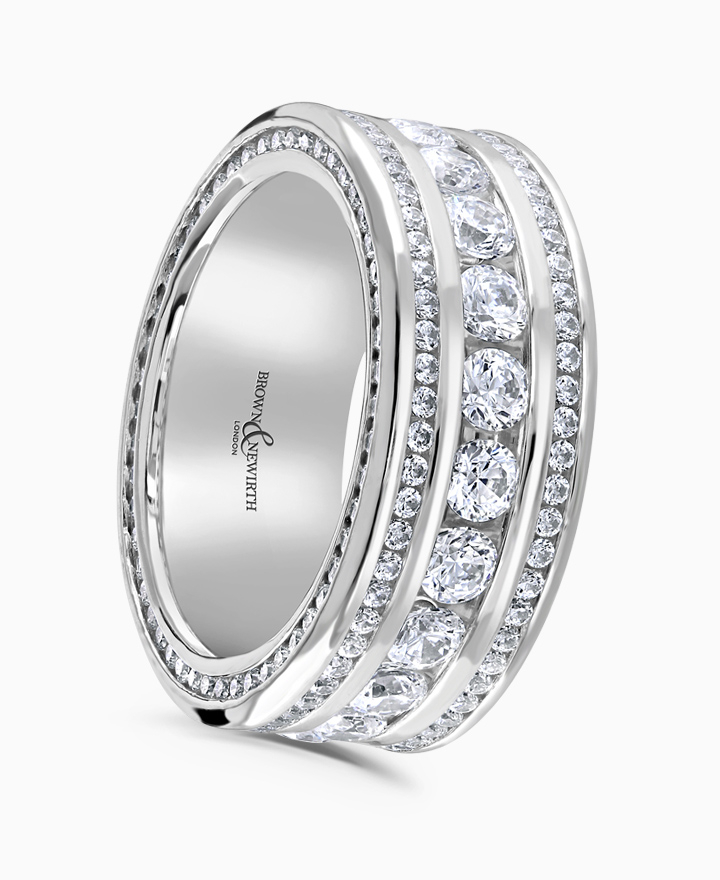 Handcrafted by Brown & Newirth; a triple row of round brilliant diamonds adorn the full hoop, elevated by matching side-set diamonds. Part of the Opulence Collection. Total carat weight 2.9ct