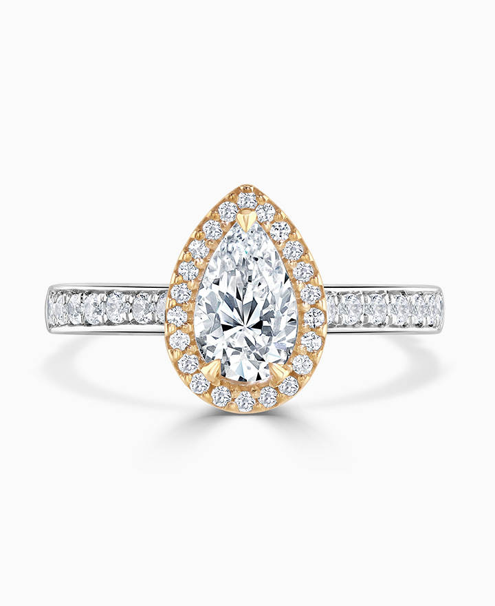 Handcrafted by Brown & Newirth; our signature 'bloom' floral detailing with diamond halo framing a pear cut diamond, presented here on a diamond set band. Centre 1.00ct, total 1.30ct. Part of the Bloom Collection.