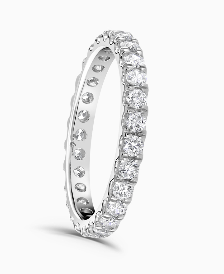 Handcrafted by Brown & Newirth; round brilliant cut diamonds adorn the full hoop of this straight edged band. Total carat weight 0.85ct