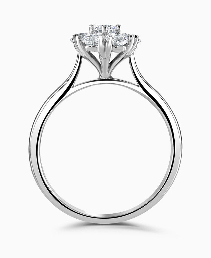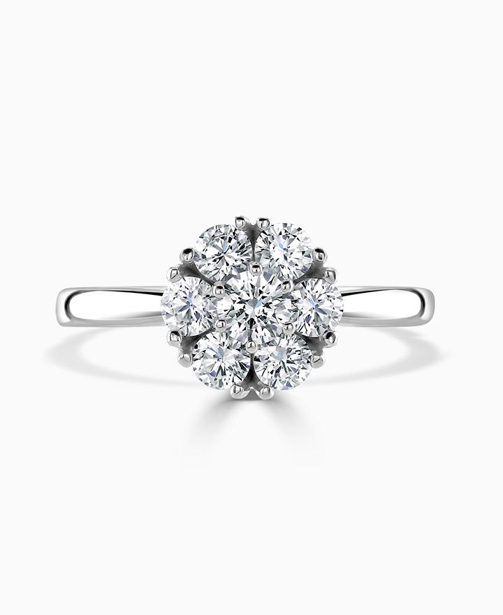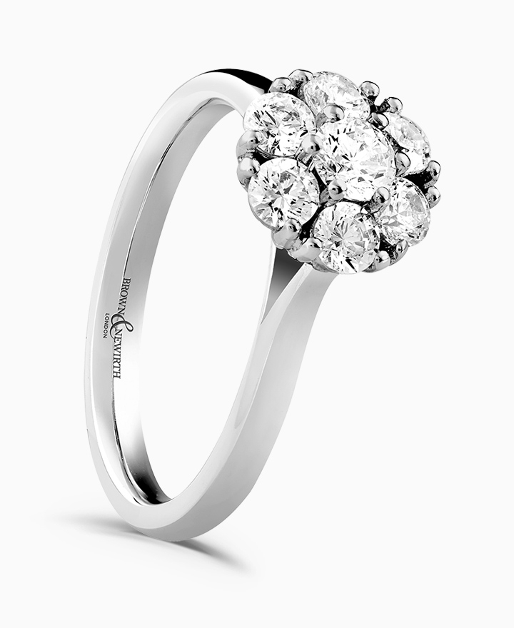 Handcrafted by Brown & Newirth; a delicate elevated cluster setting of round brilliant cut diamonds, presented here on a classic court band. 0.80ct