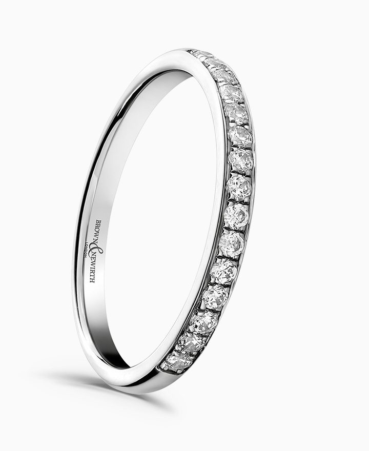 Handcrafted by Brown & Newirth; round brilliant cut diamonds adorn 40% of this classic court band. Total carat weight 0.20ct. This is part of our in stock range, available in platinum & 18ct yellow gold. Order today for quick delivery.