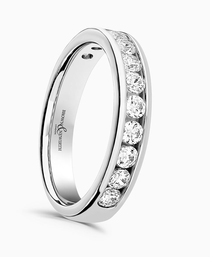Handcrafted by Brown & Newirth; round brilliant cut diamonds adorn 50% of this straight edged band. Total carat weight 0.75ct. This is part of our in stock range, available in platinum & 18ct yellow gold. Order today for quick delivery.