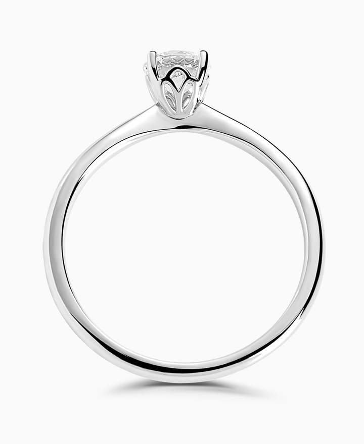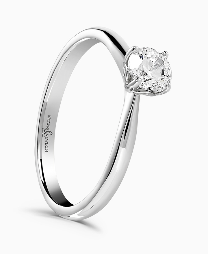 Handcrafted by Brown & Newirth; a delicate four claw setting with floral detailing perfectly elevates the round brilliant cut diamond, presented here on a classic court band. 0.50ct