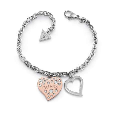 This Silver GUESS twist-effect chain bracelet features 1 Rose gold embellished charm and one hollow Silver heart.