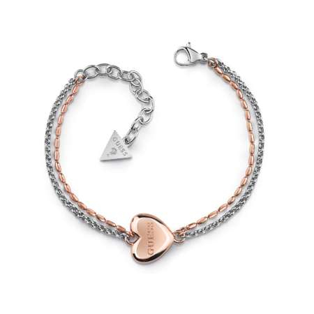 This double GUESS bracelet has a thinner Rose gold and silver chain featuring a Rose Gold guess charm in the centre.