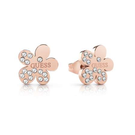 These Rose Gold flower shaped GUESS stud earrings feature crystal petals and an embossed centre logo.