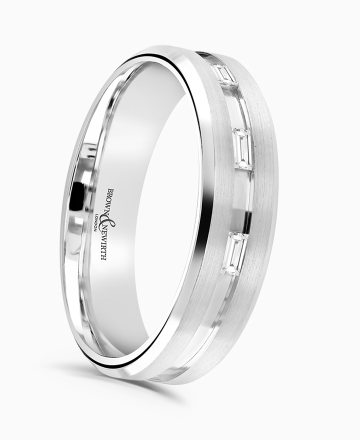 Handcrafted by Brown & Newirth; rectangular baguette diamonds run the centre of the full hoop with contrasting rails and polished bevelled edges, presented on a flat top band. Total carat weight 0.18ct