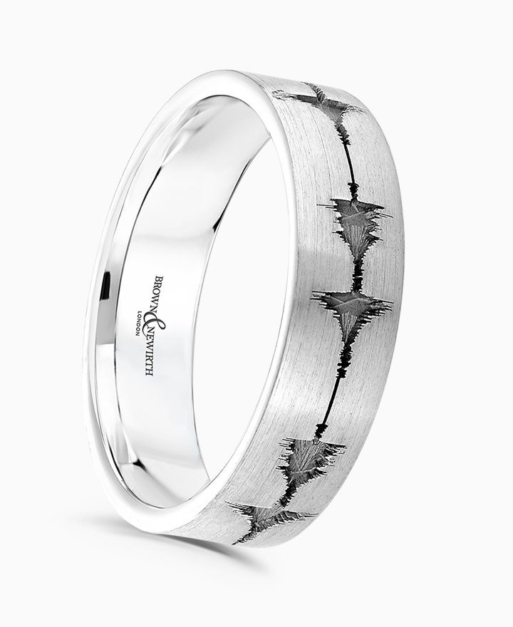 Handcrafted by Brown & Newirth; your or your loved ones heartbeat, laser engraved on our modern court profile, finished in matte in a light gauge.