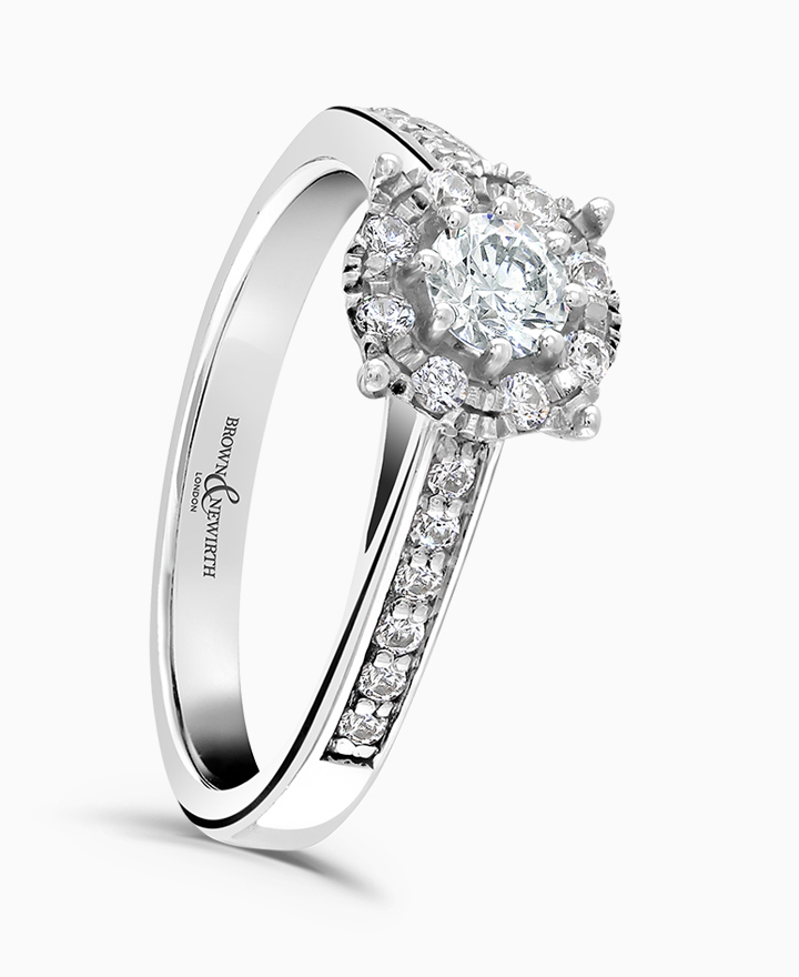 Handcrafted by Brown & Newirth; a diamond halo frames the round brilliant cut diamond, presented here with diamond set shoulders. Centre 0.12ct, total 0.29ct.