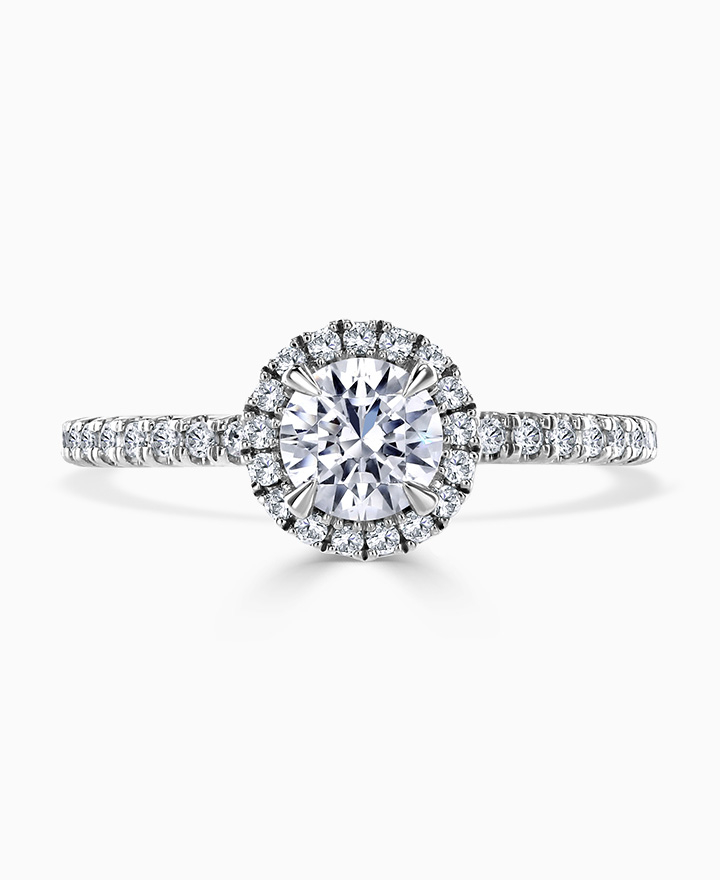 Handcrafted by Brown & Newirth; a diamond halo frames the round brilliant cut diamond, presented here with diamond set shoulders. Centre 0.70ct, total 1.04ct.