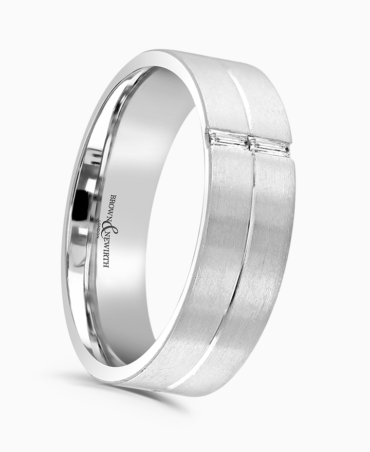 Handcrafted by Brown & Newirth; rectangular baguette diamonds run across the width of the ring, presented on a flat top band. Total carat weight of .12ct